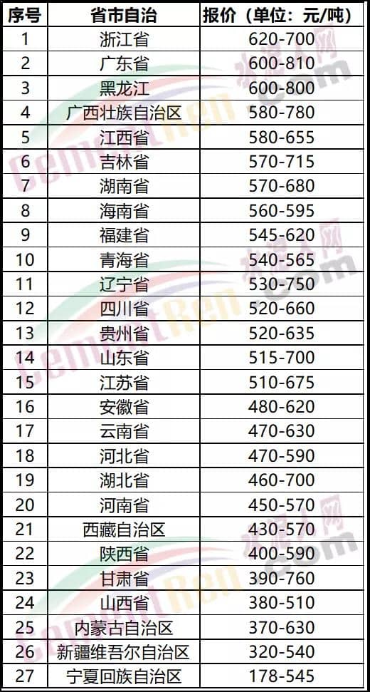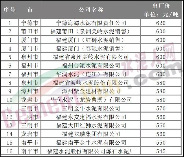 據(jù)水泥人網(wǎng)信息中心監(jiān)控?cái)?shù)據(jù),福建省內(nèi)主要品牌水泥報(bào)545-620元/噸,差價(jià)75元/噸,絕大多數(shù)企業(yè)報(bào)價(jià)仍在550元/噸左右。