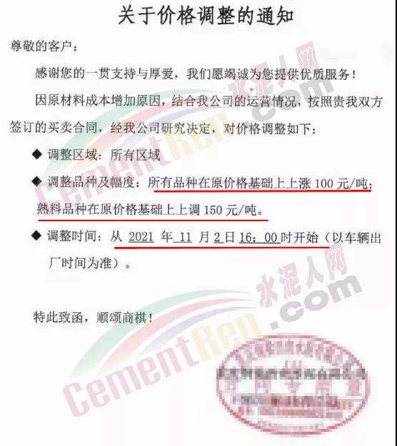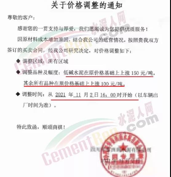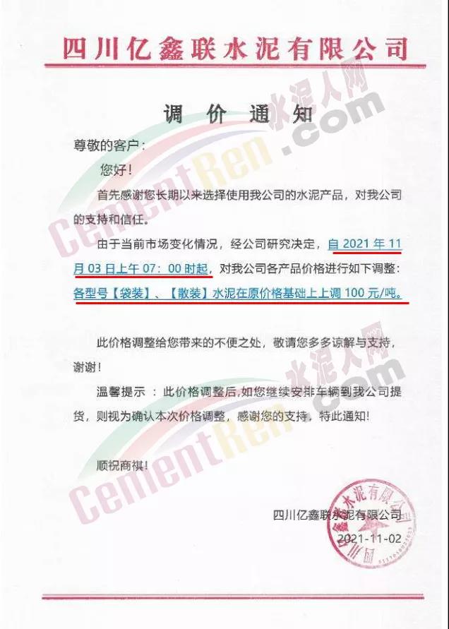 四川億鑫聯(lián)水泥有限公司通知,自11月3日上午7時(shí)起,,公司各標(biāo)號水泥價(jià)格上調(diào)100元/噸。