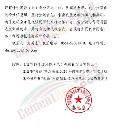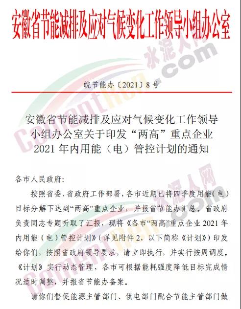 日前,安徽省節(jié)能減排及應(yīng)對(duì)氣候變化工作領(lǐng)導(dǎo)小組辦公室發(fā)布《安徽省節(jié)能減排及應(yīng)對(duì)氣候變化工作領(lǐng)導(dǎo)小組辦公室關(guān)于印發(fā)“兩高”重點(diǎn)企業(yè)2021年內(nèi)用能(電)管控計(jì)劃的通知》要求各市人民政府督促能源主管部門、供電部門配合節(jié)能主管部門做好超計(jì)劃用能(電)企業(yè)限電工作。