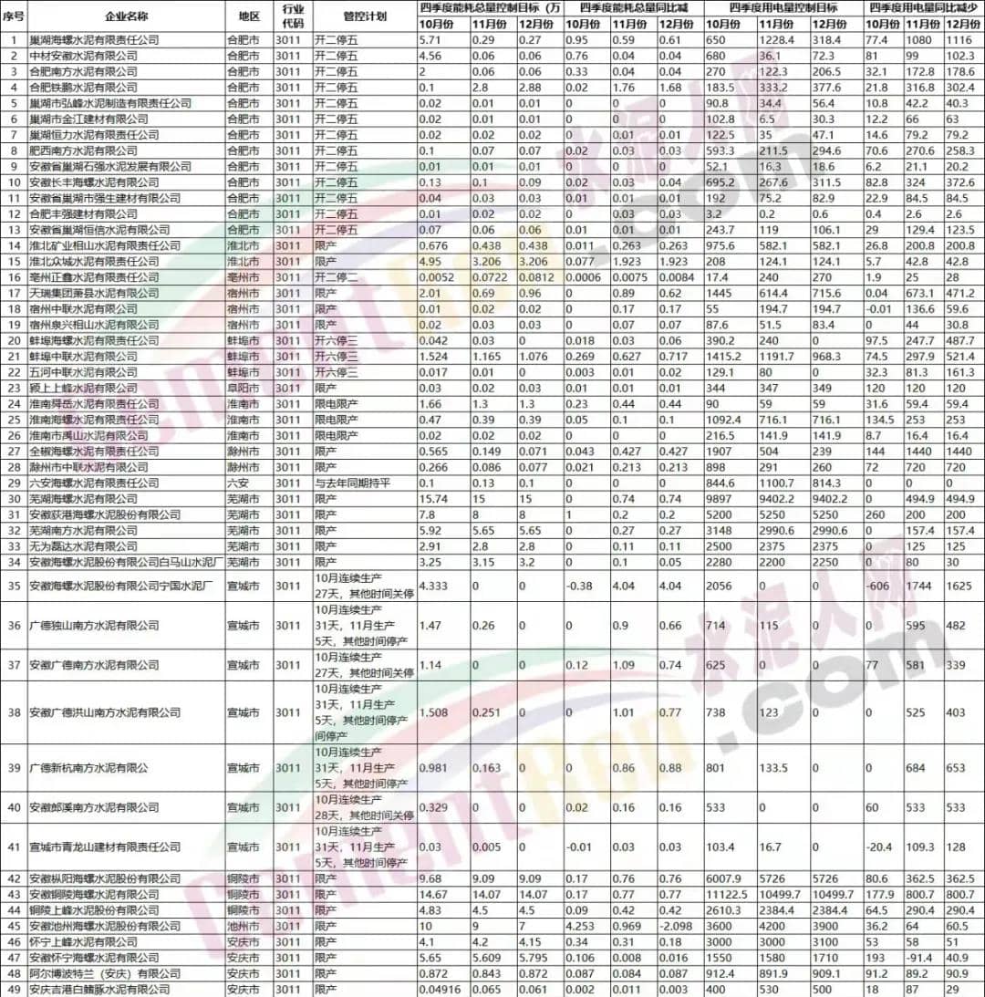 水泥人網(wǎng)注意到,通知文件附件各市“兩高”重點(diǎn)企業(yè)2021年內(nèi)用能(電)管控計(jì)劃名單中包括海螺水泥、南方水泥、中材水泥、天瑞水泥、上峰水泥、磊達(dá)水泥等近百家水泥及混凝土生產(chǎn)企業(yè)。