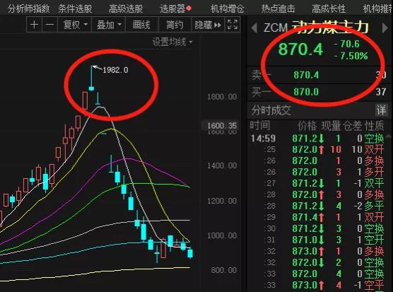 在國家各部門的共同努力之下,煤炭價格一改暴漲的勢頭,開始大幅度下滑。動力煤主力期貨更是從最高點1982暴跌至870.4,下滑56%。