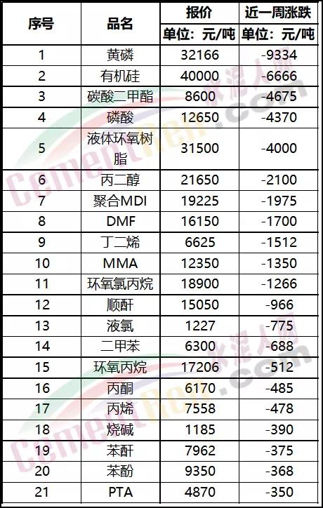 部分化工品近一周跌價一覽