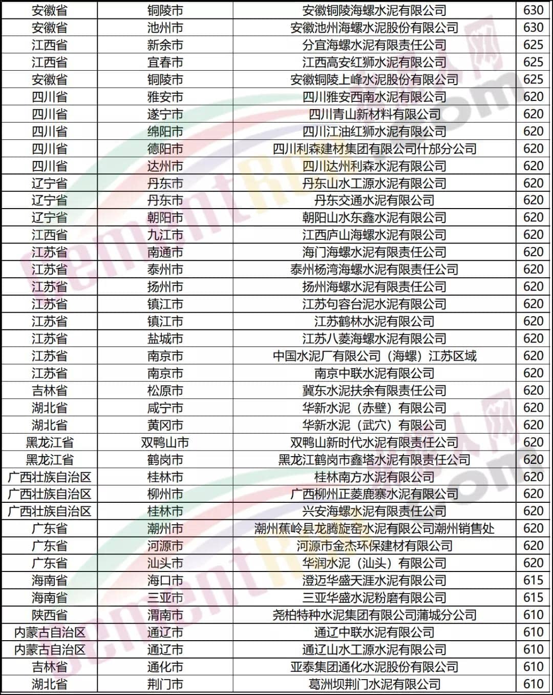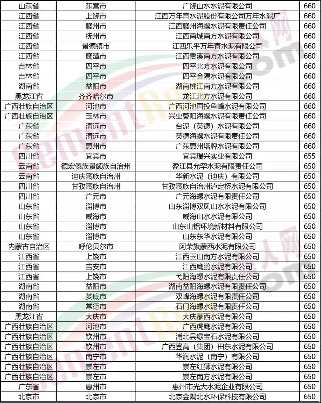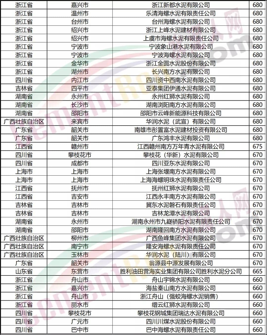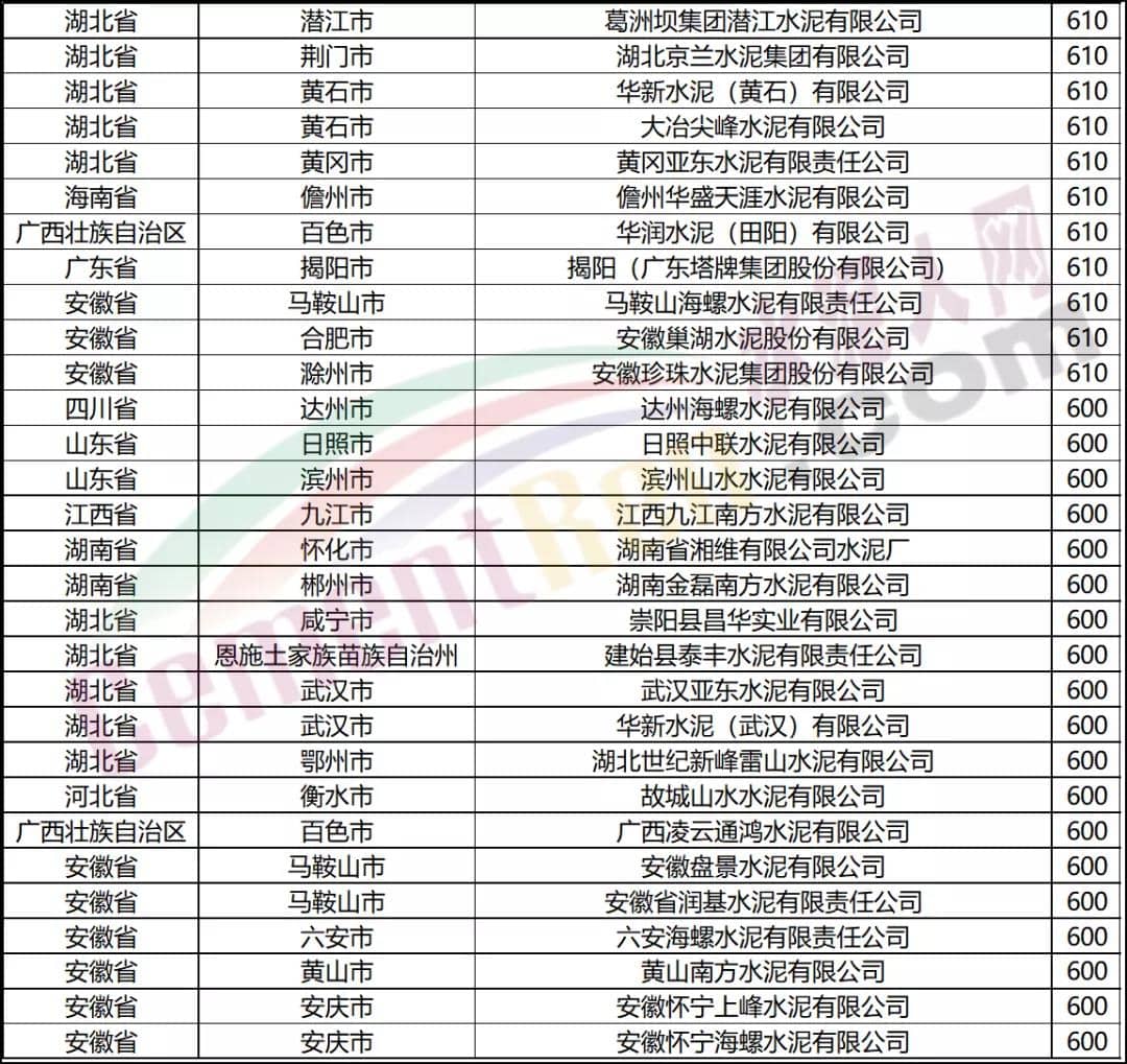 報價在600元/噸以上水泥企業(yè)名單