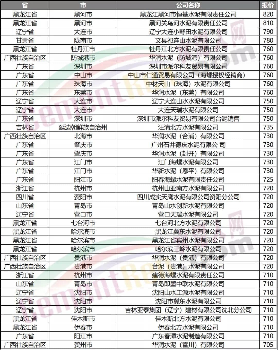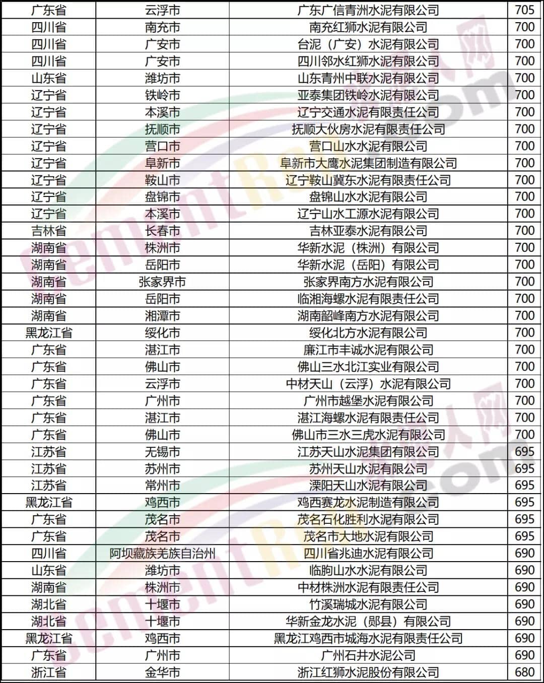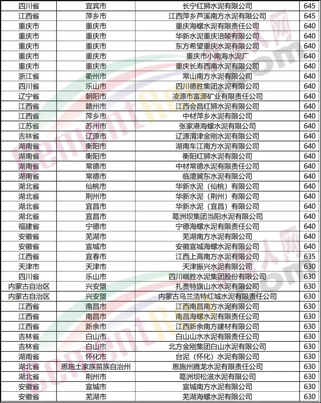 報價在600元/噸以上水泥企業(yè)名單