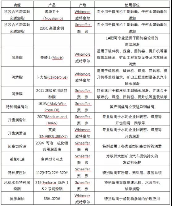 據(jù)了解,美國 whitmore威特摩爾、Schaeffer 熙弗公司擁有上千種優(yōu)秀潤滑專用特種產(chǎn)品,具有無結(jié)焦、無結(jié)碳、不沾塵、清潔衛(wèi)生無污染,一脂可多用的特性,四球極壓基本在400公斤~800公斤,軸承壽命是其它潤滑產(chǎn)品壽命的2~3倍,溫度平均可下降8度~10度,廣泛適用于水泥企業(yè)如:輥壓機(jī)、斗提、粉磨、煤磨等關(guān)健部位軸承,有利于助力水泥企業(yè)的降本增效,可為機(jī)械提供最佳潤滑保護(hù)以及最佳的潤滑難點(diǎn)技術(shù)服務(wù)。