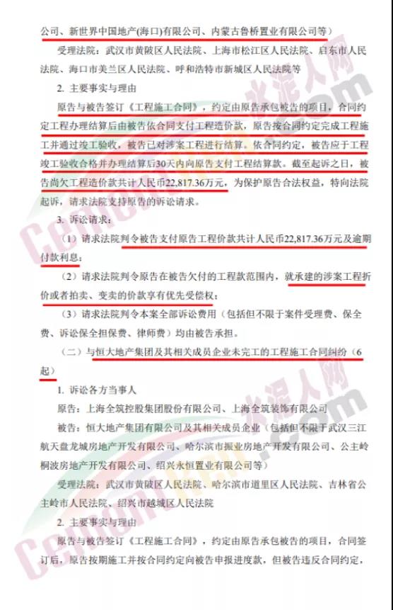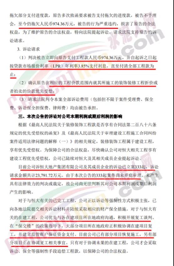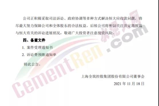 11月17日晚間,全筑股份公告稱,公司及全資子公司全筑裝飾與恒大地產(chǎn)集團(tuán)及其相關(guān)成員企業(yè)因工程款糾紛事宜已向多地法院提起訴訟。全筑股份訴恒大方面支付工程價(jià)款共計(jì)2.38億元及逾期付款利息,并承擔(dān)案件相關(guān)訴訟費(fèi)用。全筑股份表示,正積極采取司法訴訟、政府協(xié)調(diào)等多種方式解決恒大應(yīng)收款問題。