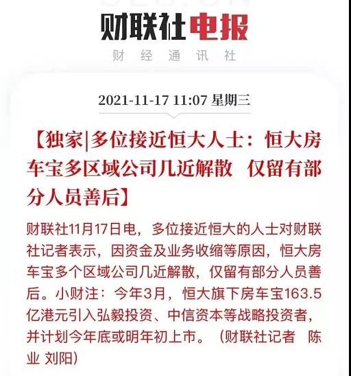 同期,多位接近恒大的人士表示,因資金及業(yè)務(wù)收縮等原因,恒大房車寶多個(gè)區(qū)域公司幾近解散,僅留有部分人員善后。