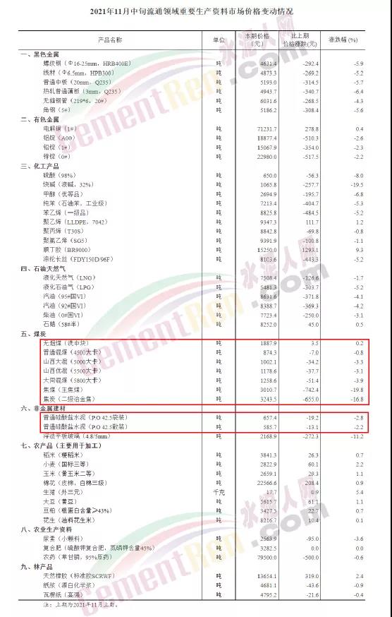 日前,國家統(tǒng)計(jì)局發(fā)布《2021年11月中旬流通領(lǐng)域重要生產(chǎn)資料市場(chǎng)價(jià)格變動(dòng)情況,據(jù)對(duì)全國流通領(lǐng)域9大類50種重要生產(chǎn)資料市場(chǎng)價(jià)格的監(jiān)測(cè)顯示,2021年11月中旬與11月上旬相比,14種產(chǎn)品價(jià)格上漲,35種下降,1種持平。其中,普通硅酸鹽水泥(P.O42.5散裝)均價(jià)585.7元/噸,較十一月上旬下跌13.1元/噸;普通硅酸鹽水泥(P.O42.5袋裝)報(bào)價(jià)657.4元,較上旬下跌19.2元/噸。