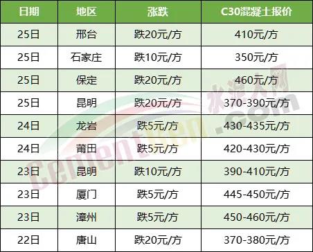 近期河北、福建、云南等多區(qū)域混凝土價(jià)格持續(xù)下跌,河北邢臺(tái)、石家莊、保定、唐山跌20元/方,C30混凝土報(bào)價(jià)350-410元/方。