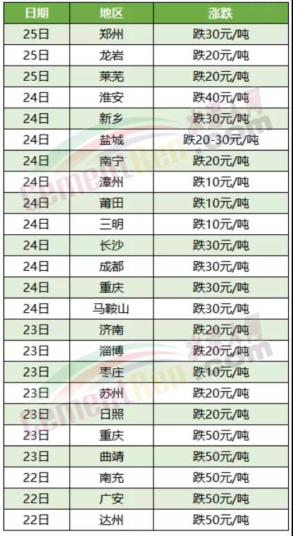 川渝地區(qū)大氣污染防控,環(huán)保管制加嚴(yán),加上一些項(xiàng)目因資金緊張,水泥市場(chǎng)需求低迷。各企業(yè)庫存高位運(yùn)行。同時(shí)遭遇外來低價(jià)水泥沖擊,競(jìng)爭(zhēng)加劇。區(qū)域主要品牌企業(yè)陸續(xù)通知下調(diào)水泥價(jià)格,其中重慶、達(dá)州、廣安、南充以及云南曲靖等多地水泥價(jià)格跌50-80元/噸。重慶區(qū)域23、24日連續(xù)兩次下調(diào)水泥價(jià)格,累計(jì)下跌50-80元/噸,絕大多數(shù)企業(yè)下調(diào)金額在20-30元/噸之間。