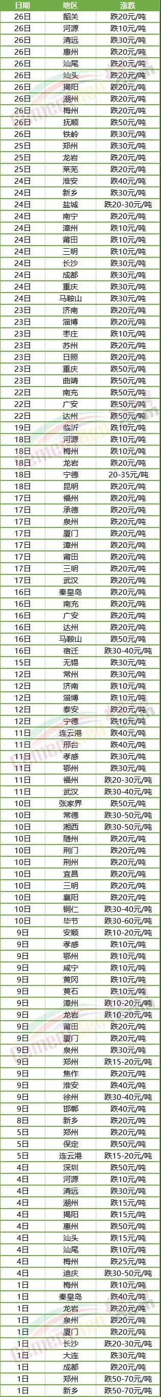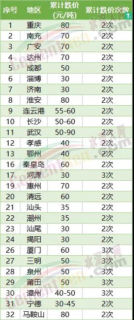 四川南充、廣安、達(dá)州、成都;山東淄博、濟(jì)南;江蘇淮安、連云港;湖北武漢、孝感、鄂州;廣東河源、惠州、清遠(yuǎn)、汕頭、潮州、汕尾、揭陽(yáng);福建廈門(mén)、三明、泉州、莆田、漳州、寧德;安徽馬鞍山、河北秦皇島、湖南長(zhǎng)沙以及重慶地區(qū)28個(gè)城市連續(xù)2-3輪下調(diào)水泥報(bào)價(jià),累計(jì)跌價(jià)30-80元/噸。