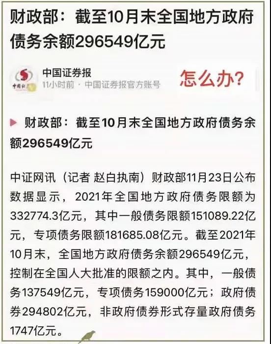 截至2021年10月末,全國(guó)地方政府債務(wù)余額296549億元,控制在全國(guó)人大批準(zhǔn)的限額之內(nèi)。其中,一般債務(wù)137549億元,專項(xiàng)債務(wù)159000億元;政府債券294802億元,非政府債券形式存量政府債務(wù)1747億元。