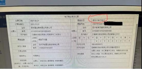 某粉絲爆料稱:手中持有的一張20萬商票,本該于11月21日兌付,但截至目前票據(jù)狀態(tài)卻顯示已拒付。從票據(jù)中能夠看出,該筆商票出票人為西安嘉寶摩碼置業(yè)有限公司,而承兌人信息欄則顯示為當(dāng)代節(jié)能置業(yè)股份有限公司。