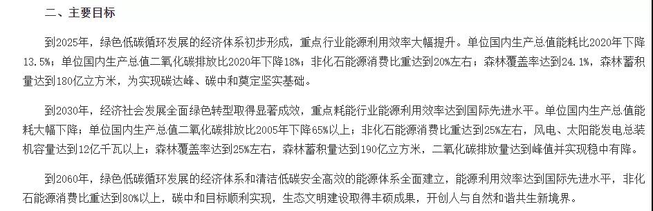 日前,中共中央、國務(wù)院印發(fā)的《關(guān)于完整準(zhǔn)確全面貫徹新發(fā)展理念做好碳達峰碳中和工作的意見》正式發(fā)布,《意見》提出到2025年,綠色低碳循環(huán)發(fā)展的經(jīng)濟體系初步形成,重點行業(yè)能源利用效率大幅提升;到2030年,經(jīng)濟社會發(fā)展全面綠色轉(zhuǎn)型取得顯著成效,重點耗能行業(yè)能源利用效率達到國際先進水平;到2060年,綠色低碳循環(huán)發(fā)展的經(jīng)濟體系和清潔低碳安全高效的能源體系全面建立,能源利用效率達到國際先進水平的主要目標(biāo)。