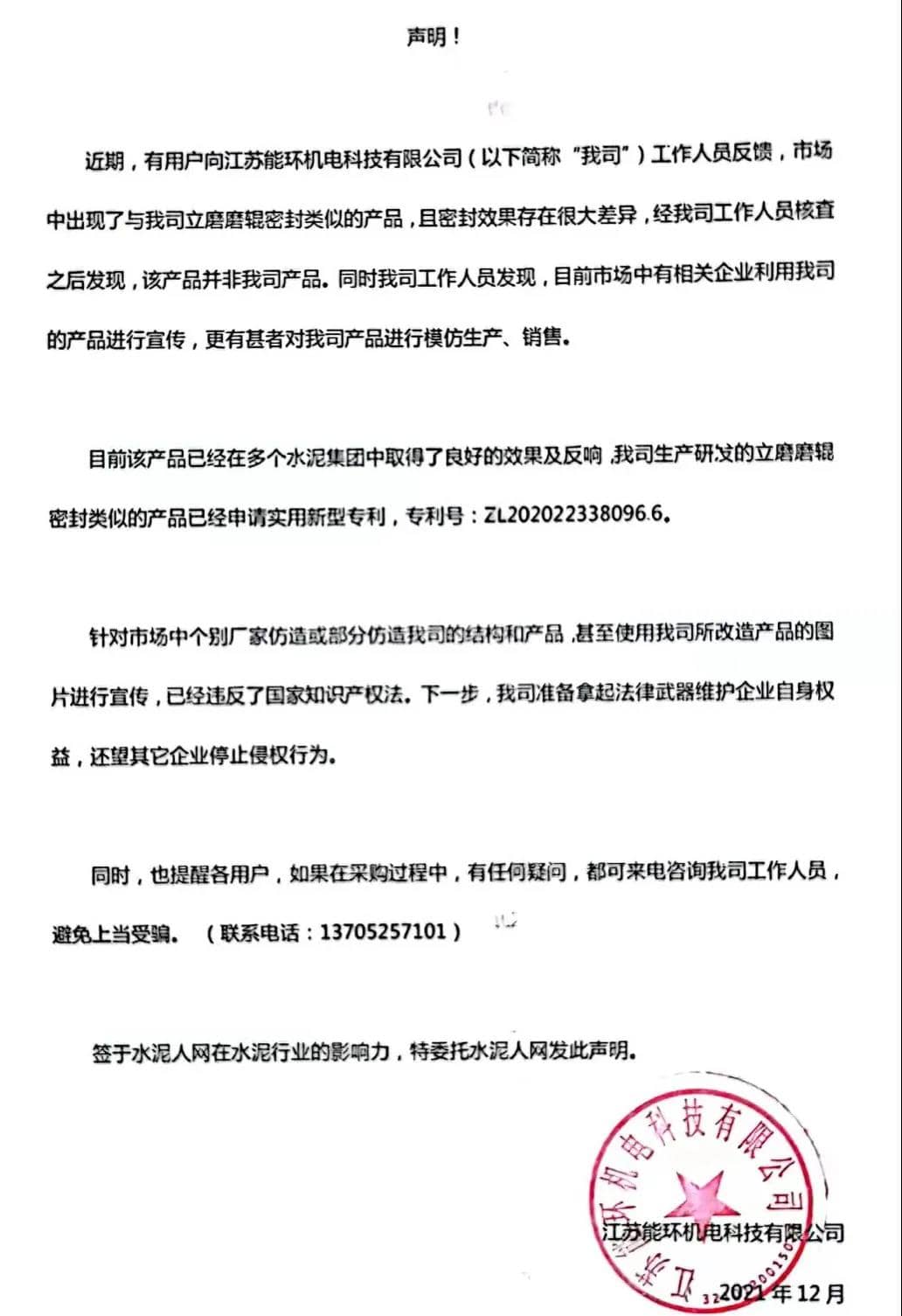 近日, 立磨磨機(jī)密封生產(chǎn)改造廠家江蘇能環(huán)機(jī)電科技有限公司(以下簡(jiǎn)稱:“江蘇能環(huán)”)委托水泥人網(wǎng)發(fā)布一則聲明,聲明內(nèi)容如下: