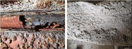 窯尾除塵器腐蝕現(xiàn)象(左)窯尾除塵器“糊袋”現(xiàn)象(右)