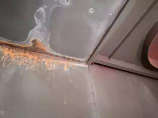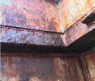 殼體焊縫區(qū)域,由于焊條與殼體基材存在成分差異,焊縫影響區(qū)域與基材亦存在成分差異,成分差異會加速電化學(xué)腐蝕。板材連接區(qū)域及夾角區(qū)域,細(xì)小縫隙聚集酸性凝結(jié)液后,形成“縫隙腐蝕”,加快腐蝕發(fā)展速度。現(xiàn)場實(shí)地勘察發(fā)現(xiàn),焊縫區(qū)域和板材連接區(qū)域的腐蝕比其他區(qū)域更為嚴(yán)重。