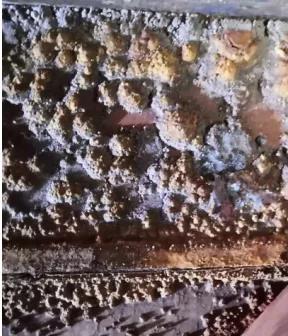 硫酸氫銨具有較強(qiáng)的吸附性、粘性和吸濕性,附著在殼體壁板表面后吸附粉塵、水分以及更多的腐蝕物質(zhì),使得附著點(diǎn)腐蝕加速,形成大量腐蝕產(chǎn)物。硫酸氫銨腐蝕典型的特征為腐蝕產(chǎn)物形成密集腐蝕堆,外觀表象多為暗黃色及灰黃色,且周圍分布有白色結(jié)晶鹽。
