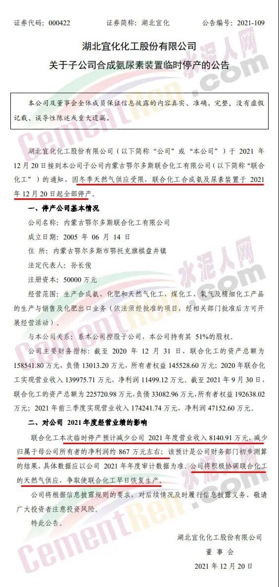 近日,國內(nèi)化肥巨頭湖北宜化集團發(fā)布公告稱,于2021年12月20日接到其子公司內(nèi)蒙古鄂爾多斯聯(lián)合化工有限公司的通知,因冬季天然氣供應(yīng)受限,聯(lián)合化工合成氨及尿素裝置于2021年12月20日起全部停產(chǎn)。