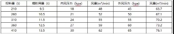 滿產(chǎn)時,齒槽內(nèi)風推薦使用壓力30kpa,最大使用壓力35kpa,外風推薦使用壓力55kpa,最大使用壓力65kpa;投料期間,二次風溫低于1000℃,中心風全關,高于1000℃,現(xiàn)場表壓壓力控制在5000pa以內(nèi);冷卻風在滿產(chǎn)后開啟,2000-3000pa壓力即可。