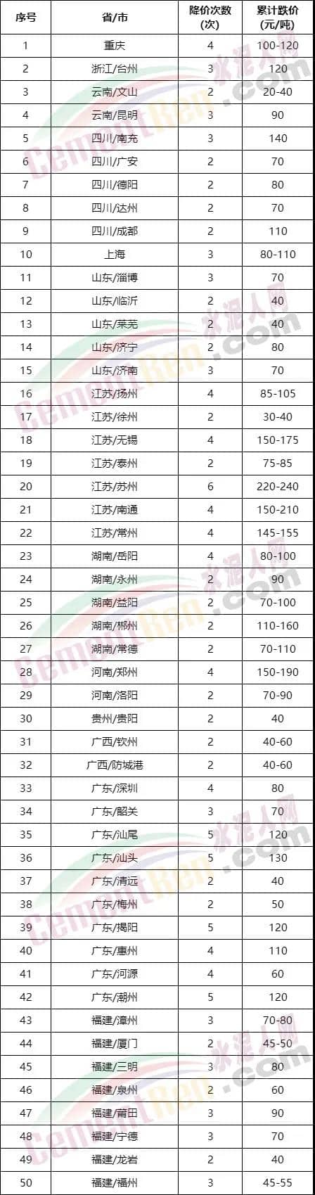 12月份多區(qū)域水泥價格持續(xù)下跌中,據(jù)不完全統(tǒng)計(jì),江蘇蘇州、南充等區(qū)域水泥價格月內(nèi)下跌達(dá)到200元/噸以上,蘇州區(qū)域6次下調(diào)水泥價格,累計(jì)跌價達(dá)到240元/噸。而且,除了江蘇,浙江、山東、福建、四川、云南、貴州、湖南、河南、廣東、廣西、上海、重慶等10余個省市自治區(qū)50個區(qū)域水泥價格均經(jīng)歷了2次以上的下跌。