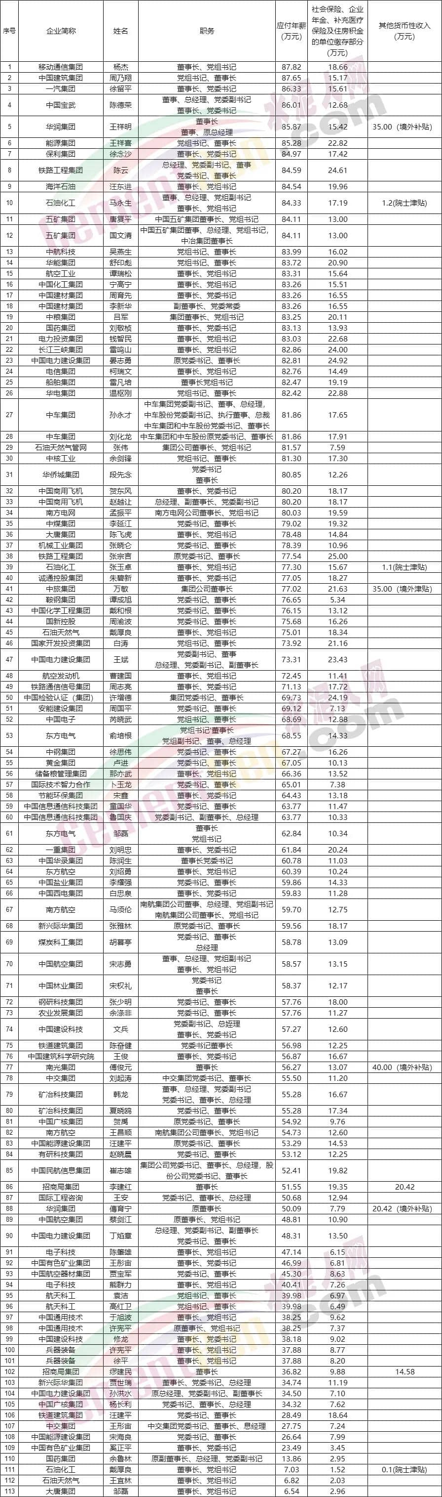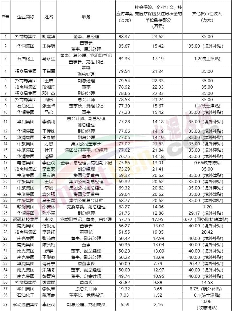各企業(yè)集團董事長、副董事長薪酬一覽
