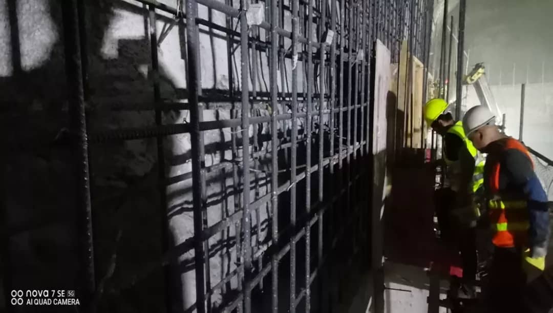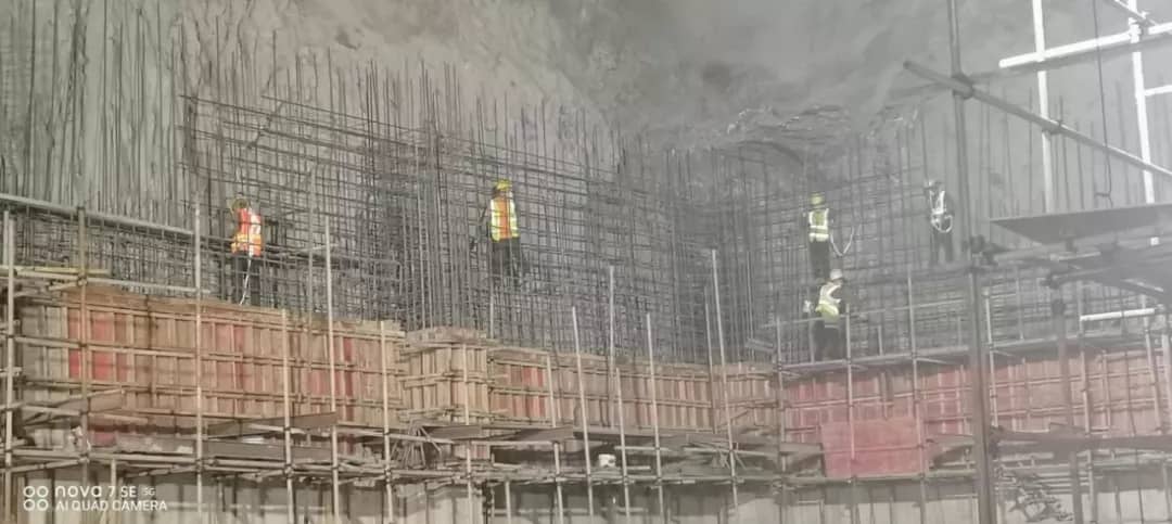 1#、2#破碎硐室是整個開拓系統(tǒng)工程的“咽喉”,上連主礦倉,下連皮帶輸送平硐,其施工質(zhì)量和進度對整個開拓系統(tǒng)工程至關重要。破碎硐室圍巖性質(zhì)較差,且斷面大,高度高,凈高度達25米,對硐室開挖和支護帶來很大困難;破碎硐室后期腳手架搭設量大,鋼筋制作、綁扎量大,模板工程量大,混凝土澆筑量大,結(jié)構復雜,且作業(yè)空間受限,給土建施工帶來極大的挑戰(zhàn)。對于1#、2#破碎硐室的施工,為保證安全、質(zhì)量和進度,項目部多次組織圖紙會審,認真分析每個施工環(huán)節(jié),在施工過程中合理安排施工順序,加強組織協(xié)調(diào),增開措施巷道,有效地保證了破碎硐室的順利施工。