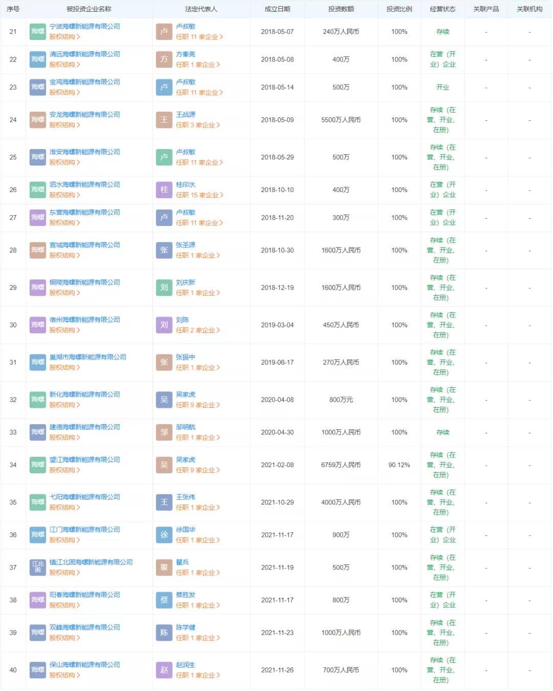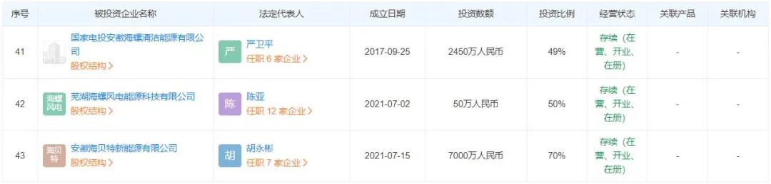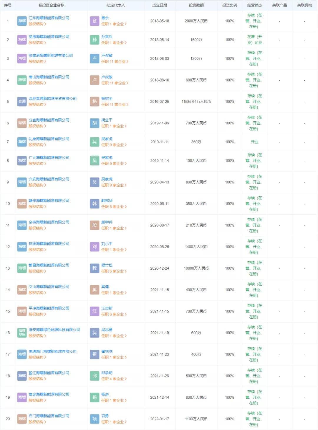 天眼查查詢結(jié)果顯示,安徽海螺新能源有限公司成立于2018年,法定代表人為李曉波,經(jīng)營(yíng)范圍包含光伏發(fā)電、風(fēng)力發(fā)電、儲(chǔ)能系統(tǒng)領(lǐng)域內(nèi)的技術(shù)開發(fā)等,由海螺水泥100%控股,對(duì)外投資了包含江華海螺新能源有限公司、英德海螺新能源有限公司、張家港海螺新能源有限公司在內(nèi)的43家企業(yè)。具體如下: