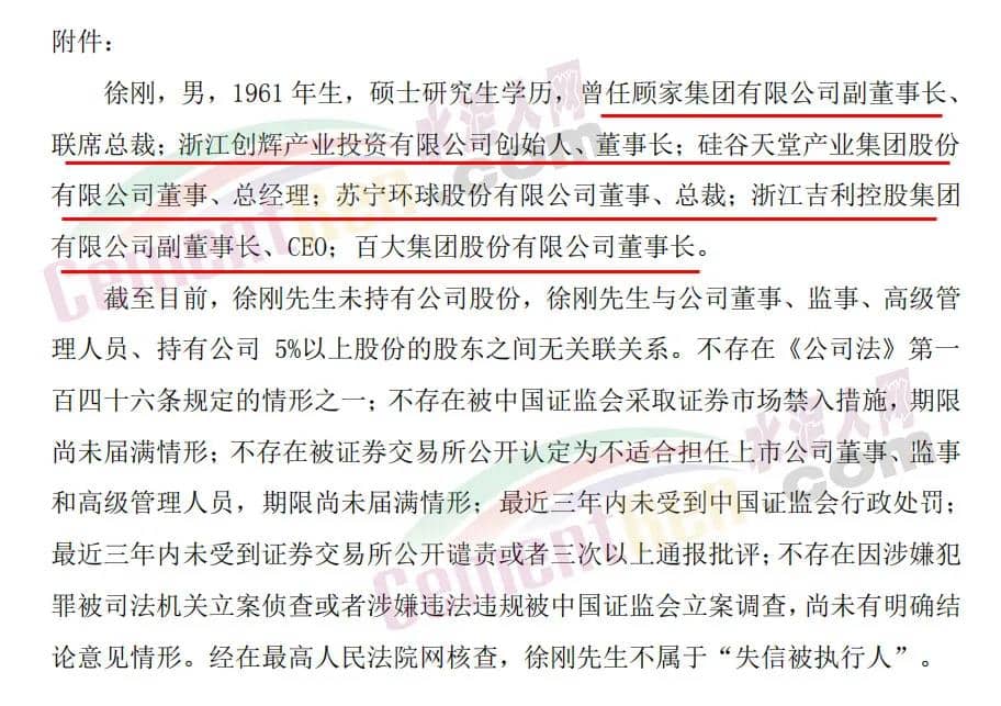 新任董事長徐剛簡歷顯示,其曾任顧家集團有限公司副董事長、聯(lián)席總裁;浙江創(chuàng)輝產(chǎn)業(yè)投資有限公司創(chuàng)始人、董事長;硅谷天堂產(chǎn)業(yè)集團股份有限公司董事、總經(jīng)理;蘇寧環(huán)球股份有限公司董事、總裁;浙江吉利控股集團有限公司副董事長、CEO;百大集團股份有限公司董事長。