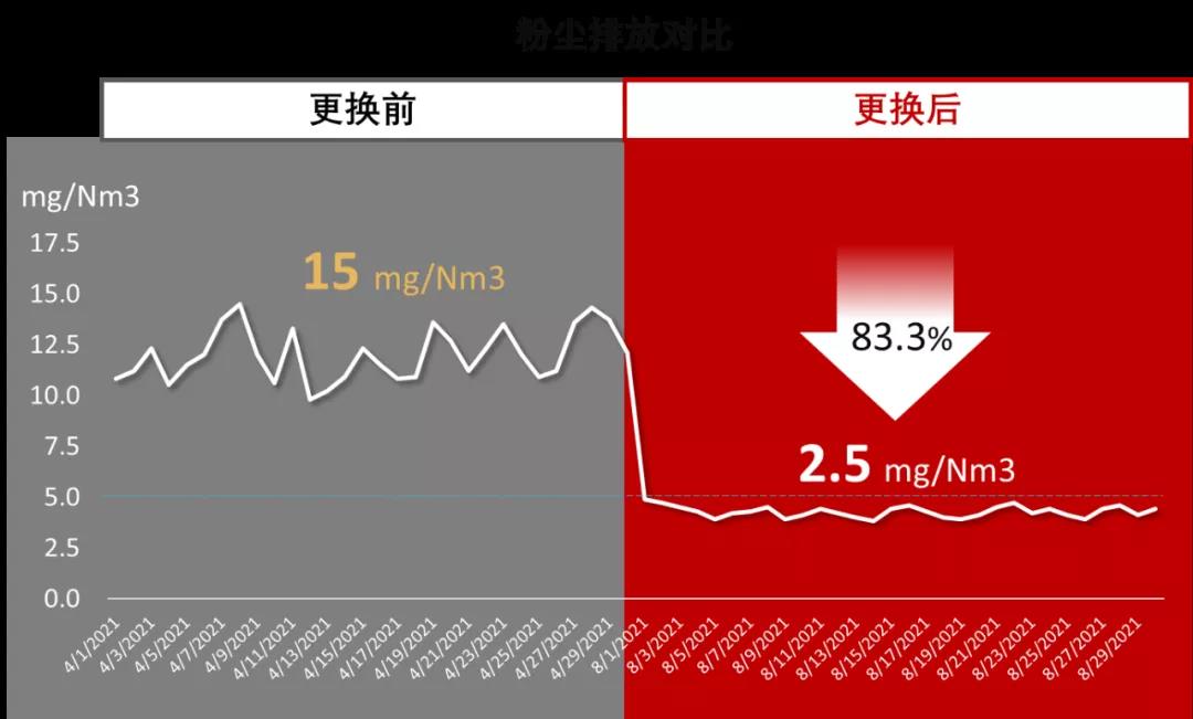 為此,該水泥廠經(jīng)過多方案對比和討論,最終決定將收塵系統(tǒng)濾袋全部更換為與原濾袋規(guī)格一致的戈爾GORE®低阻濾袋。更換濾袋后,經(jīng)過3個月的連續(xù)穩(wěn)定運(yùn)行,系統(tǒng)各項(xiàng)指標(biāo)均出現(xiàn)了明顯的積極變化,收塵系統(tǒng)不但實(shí)現(xiàn)了粉塵低排放,同時,降低了系統(tǒng)運(yùn)行阻力及系統(tǒng)運(yùn)行電耗,有效降低了總運(yùn)營成本。