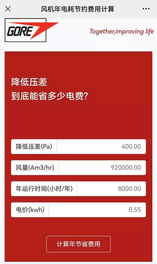 如今,戈爾已經(jīng)與世界各大水泥生產(chǎn)商發(fā)展了密切的合作關(guān)系,幫助水泥企業(yè)大大降低一次投資及運(yùn)行費(fèi)用,但是仍有部分水泥企業(yè)存在“降低壓差到底能省多少電費(fèi)?”的困惑,為此,戈爾推出一鍵計算平臺,輸入基本數(shù)據(jù)即可輕松計算出年節(jié)省費(fèi)用:
