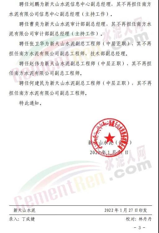 聘任何建民為新天山水泥副總工程師(中層正職),其不再擔(dān)任南方水泥有限公司副總工程師。