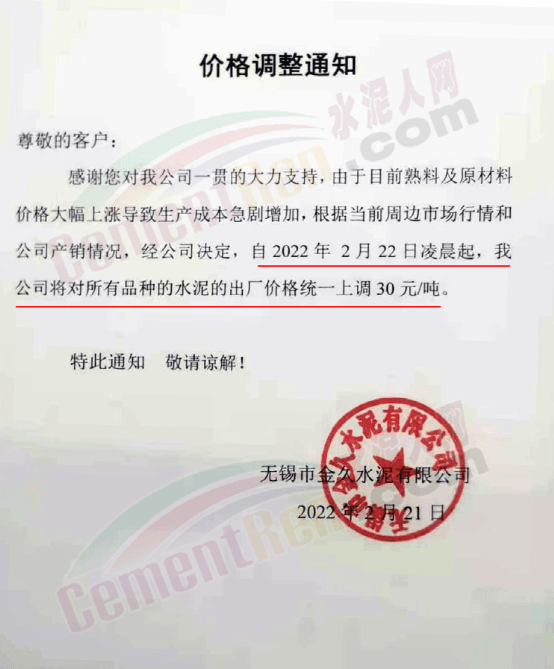 日前 ,無錫市金久水泥有限公司通知,由于目前熟料原材料價格大幅上漲導致生產(chǎn)成本急劇增加,根據(jù)當前周邊市場行情和公司產(chǎn)銷情況,經(jīng)公司決定自2月22日凌晨起,公司將對所有品種的水泥出廠價統(tǒng)一上調30元/噸。