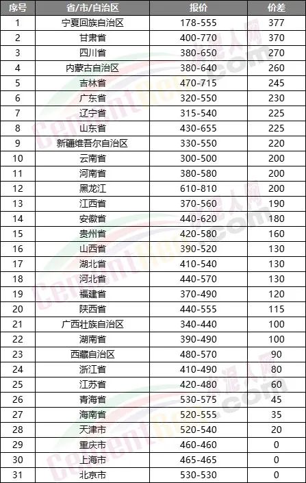 從同一省市自治區(qū)內高低差價來入看,寧夏回族自治區(qū)、甘肅、四川、內蒙自治區(qū)、吉林 、廣東、遼寧、山東 、新疆、云南、河南、黑龍江等區(qū)域差價均在200元/噸以及上區(qū)間。相鄰區(qū)域較大差價的存在或是“價格戰(zhàn)”導火索的誘因。