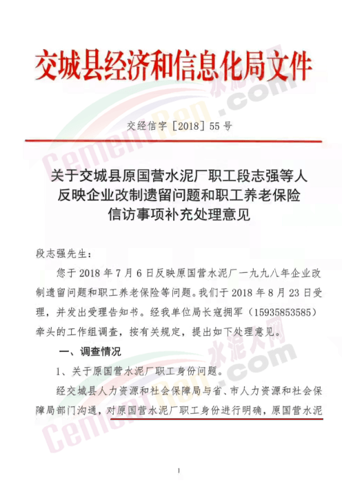 網(wǎng)友提供的文件顯示,2018年9月28日,交城縣經(jīng)信局《關(guān)于交城縣原國營水泥廠職工段志強(qiáng)等人反映企業(yè)改制遺留問題和職工養(yǎng)老保險信訪事項補(bǔ)充處理意見》的文件提到,段志強(qiáng)于2018年7月6日反映原國營水泥廠一九九八年企業(yè)改制遺留問題和職工養(yǎng)老保險等問題。已于當(dāng)年8月23日受理,并發(fā)出受理告知書。工作組調(diào)查,按有關(guān)規(guī)定,提出如下處理意見。
