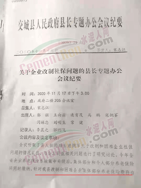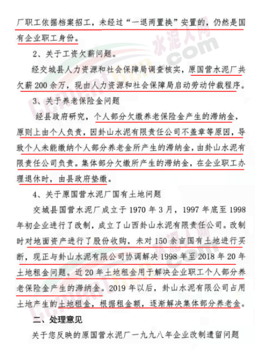 日前,有網(wǎng)友向水泥人網(wǎng)反映,交城縣原國營水泥廠企業(yè)改制遺留問題和職工養(yǎng)老保險問題至今未得到解決幾點問題。