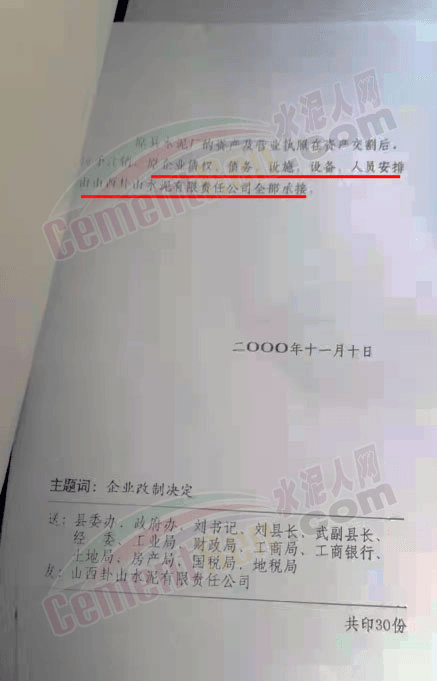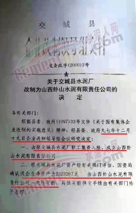 2000年交城縣《關(guān)于交城縣水泥廠改制為山西卦山水泥有限責(zé)任公司的決定》文件中提到,經(jīng)縣委、政府1997年12月19日企業(yè)改制領(lǐng)導(dǎo)組會議研究決定,由原交城縣水泥廠職工集資入股,成立山西卦山水泥有限公司。