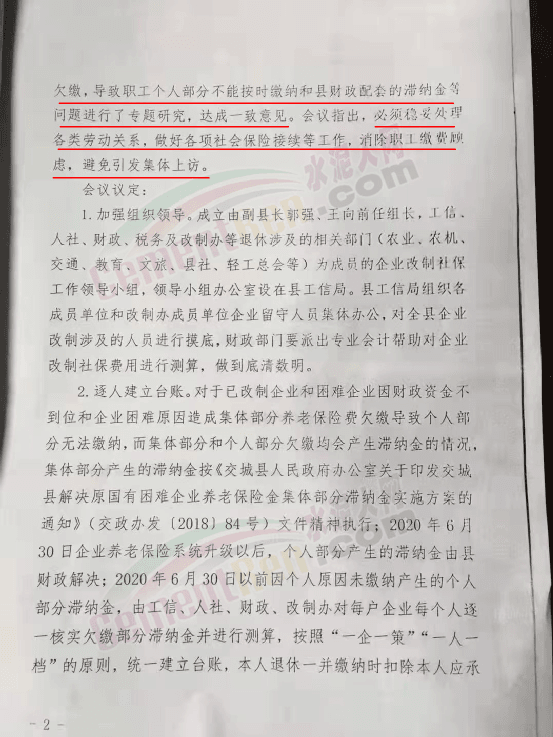 交城縣2020年11月17日《關(guān)于企業(yè)改制社保問題的縣長專題辦公會議紀(jì)要》中提到會議針對改制和困難企業(yè)集體部分養(yǎng)老保險費存在欠繳,導(dǎo)致職工個人部分不能按時繳納和縣財政配套的滯納金等問題進(jìn)行了專題研究,且達(dá)成了一致意見。會議指出,必須穩(wěn)妥處理各類勞動關(guān)系,做好各項社會保險接續(xù)等工作,消除職工繳費顧慮,避免引發(fā)集體上訪。