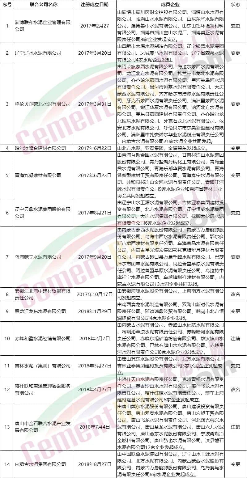 據(jù)查詢(xún),自2017年以來(lái)國(guó)內(nèi)行業(yè)成立的水泥區(qū)域聯(lián)合公司共14家。