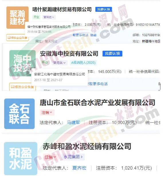 據(jù)愛(ài)企查數(shù)據(jù)顯示,截止目前上述聯(lián)合水泥公司多數(shù)已經(jīng)進(jìn)行了變更。涉及企業(yè)名稱(chēng)、經(jīng)營(yíng)范圍變更、人員變更、出資比例變更、市場(chǎng)主體類(lèi)型變更以及股權(quán)變更等多個(gè)項(xiàng)目。其中,喀什聯(lián)和惠澤管理咨詢(xún)服務(wù)有限公司、安徽江北海中建材貿(mào)易有限責(zé)任公司兩家企業(yè)已更名;唐山金石聯(lián)合水泥產(chǎn)業(yè)發(fā)展有限公司、赤峰和盈水泥經(jīng)銷(xiāo)有限公司已為“注銷(xiāo)”狀態(tài)。