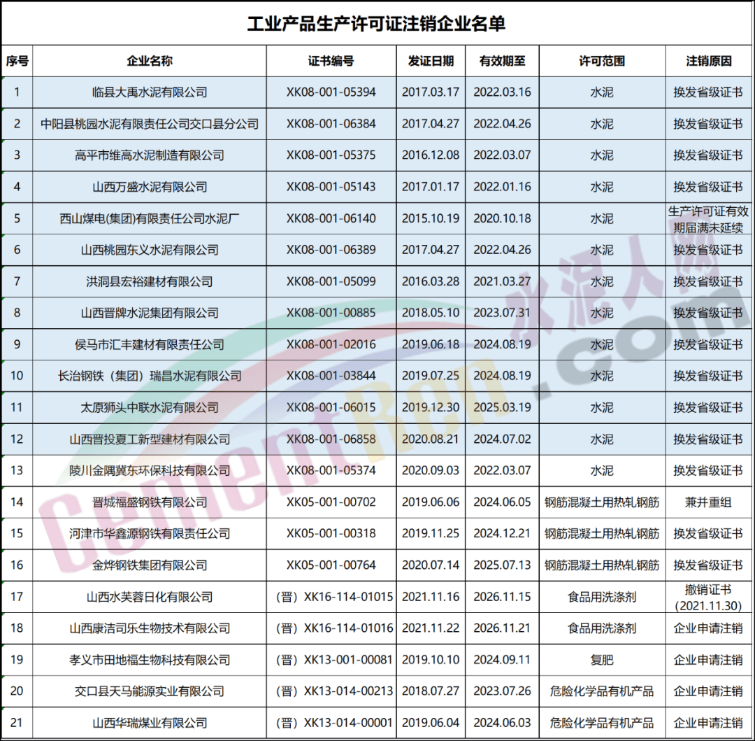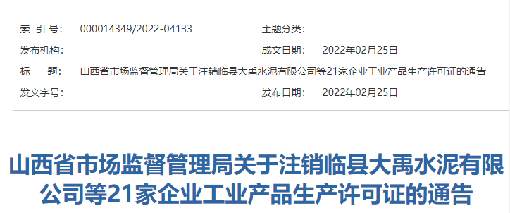 日前,山西省市場(chǎng)監(jiān)管局發(fā)布《關(guān)于注銷(xiāo)臨縣大禹水泥有限公司等21家企業(yè)工業(yè)產(chǎn)品生產(chǎn)許可證的通告》稱,按照相關(guān)規(guī)定,山西省市場(chǎng)監(jiān)督管理局決定對(duì)臨縣大禹水泥有限公司等21家企業(yè)工業(yè)產(chǎn)品生產(chǎn)許可證予以注銷(xiāo)(名單見(jiàn)附件)。