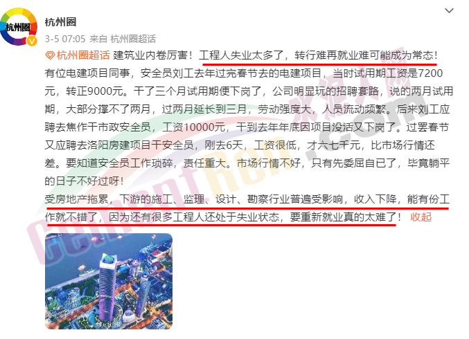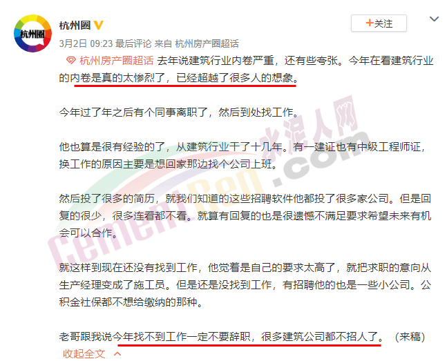 去年說建筑行業(yè)內(nèi)卷嚴重,還有些夸張。今年在看建筑行業(yè)的內(nèi)卷是真的太慘烈了,已經(jīng)超越了很多人的想象。今年過了年之后有個同事離職了,然后到處找工作。
