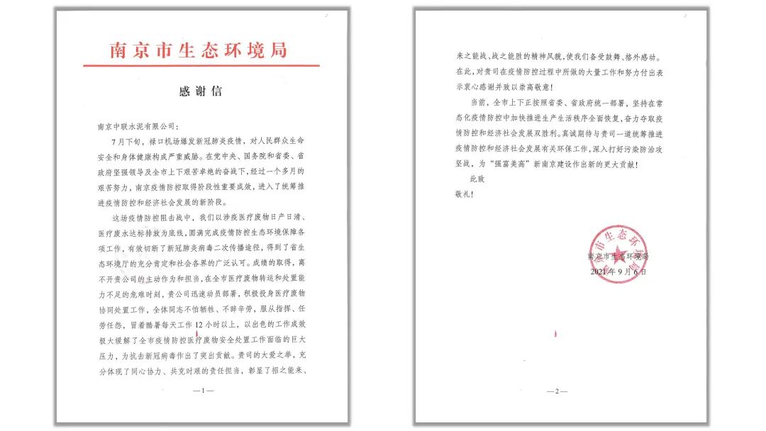 “貴司的大愛之舉,充分體現(xiàn)了同心協(xié)力、共克時艱的責(zé)任擔(dān)當(dāng),彰顯了招之能來、來之能戰(zhàn)、戰(zhàn)之能勝的精神風(fēng)貌,使我們備受鼓舞、格外感動。在此,對貴司在疫情防控過程中所做的大量工作和努力付出表示衷心感謝并致以崇高敬意!”這是南京市生態(tài)環(huán)境局于2021年9月6日給予南京中聯(lián)水泥有限公司的一封感謝信。
