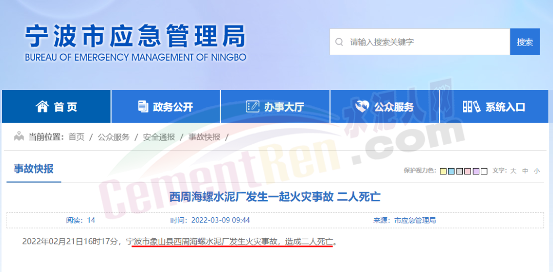 3月9日,浙江省寧波市應(yīng)急管理局發(fā)布消息,2022年02月21日16時17分,寧波市象山海螺水泥廠發(fā)生火災(zāi)事故,造成兩人死亡。