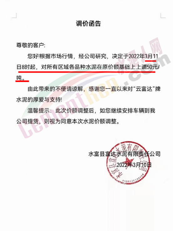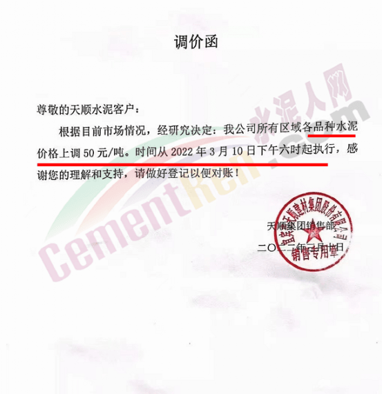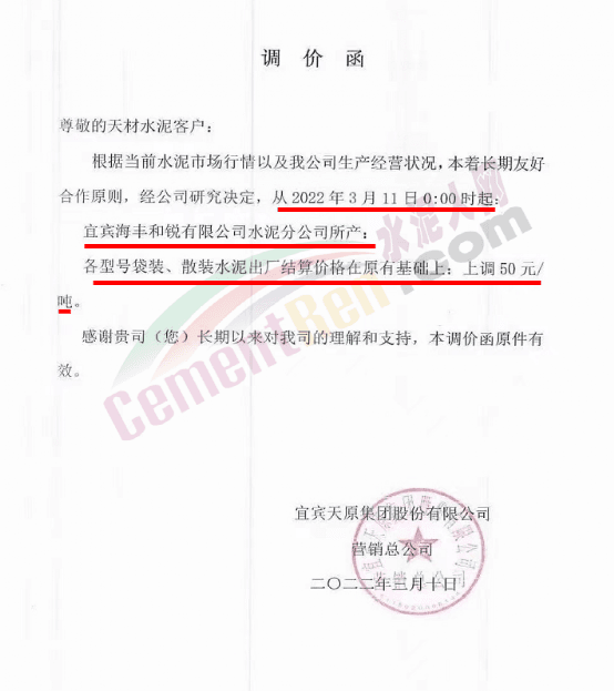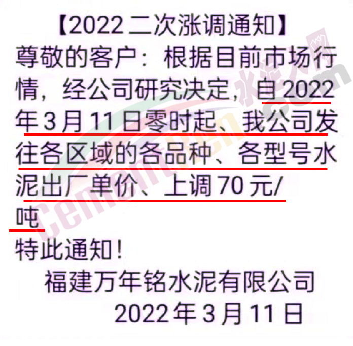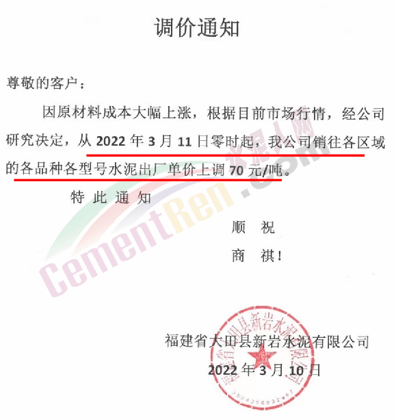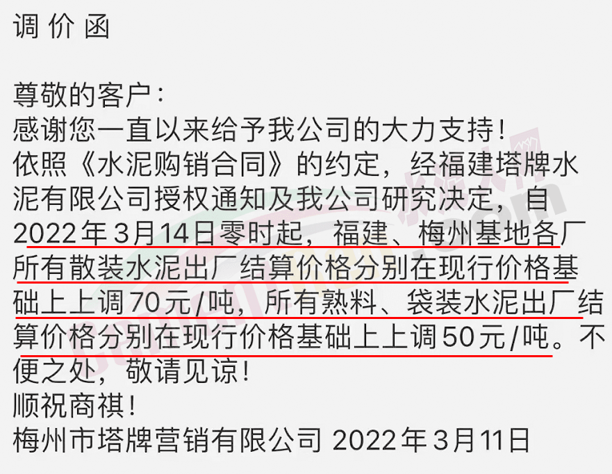 梅州市塔牌營銷有限公司通知,依照《水泥購銷合同》的約定,經福建塔牌水泥有限公司授權通知及我公司研究決定,自2022年3月14日零時起,福建、梅州基地各廠所有散裝水泥出廠結算價格分別在現行價格基礎上上調70元/噸,所有熟料、袋裝水泥出廠結算價格分別在現行價格基礎上上調50元/噸。