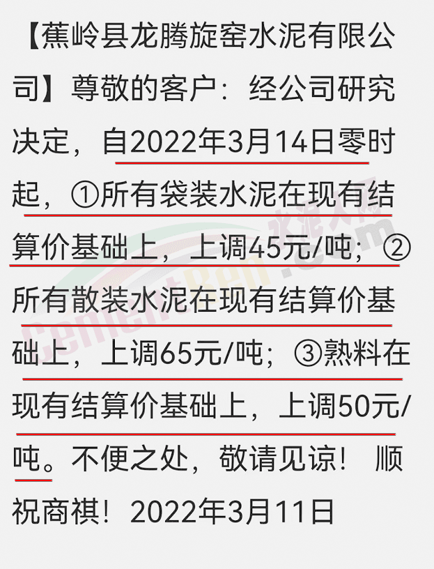 蕉嶺縣龍騰旋窯水泥有限公司通知自2022年3月14日零時起,所有袋裝水泥在現有結算價基礎上,上調45元/噸;所有散裝水泥在現有結算價基礎上,上調65元/噸;熟料在現有結算價基礎上,上調50元/噸。