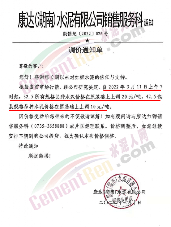 據水泥人網了解,春節(jié)后開工至今,湖南各區(qū)域水泥價格普遍呈上漲趨勢。紅獅水泥旗下康達(湖南)水泥有限公司銷售服務科通知,根據當前市場行情,經公司研究決定,自2022年3月11日上午7時起,32.5所有規(guī)格品種水泥價格在原基礎上上調20元/噸,42.5包裝規(guī)格品種水泥價格在原基礎上上調10元/噸。