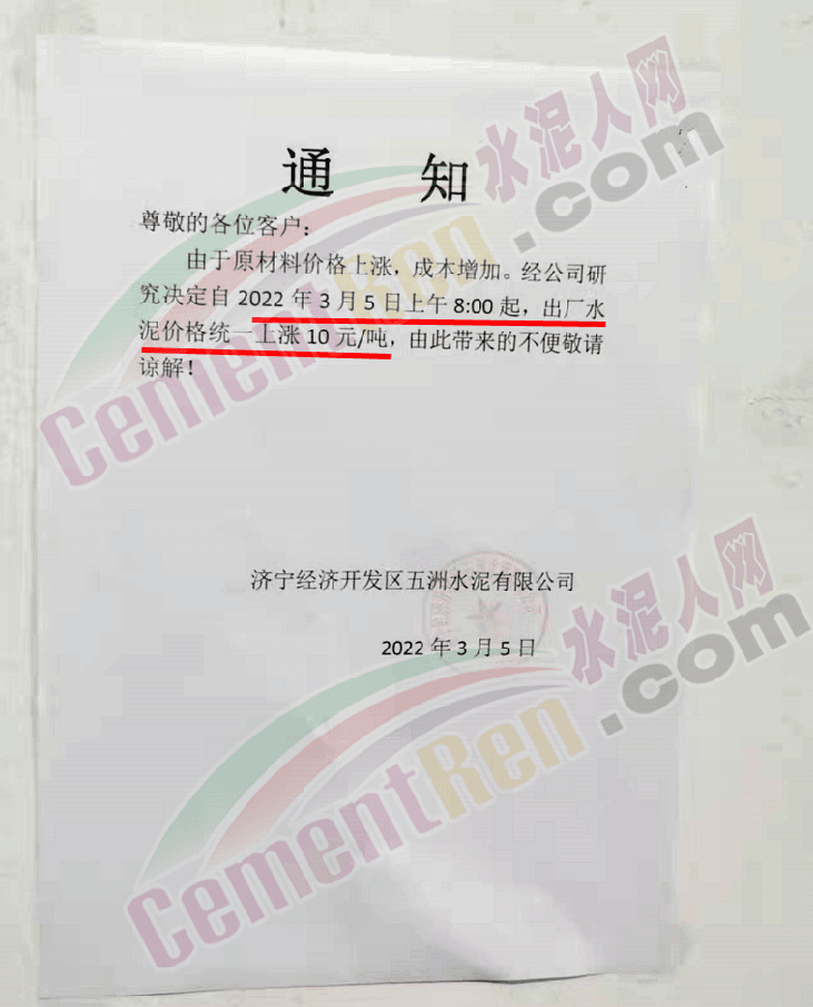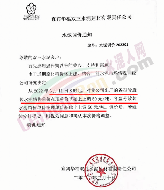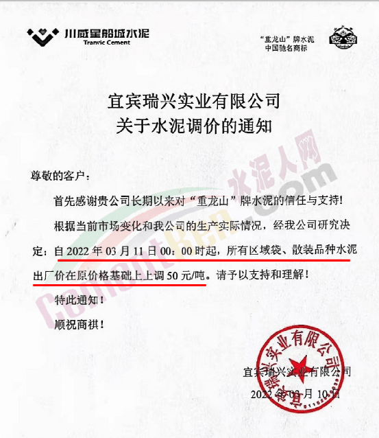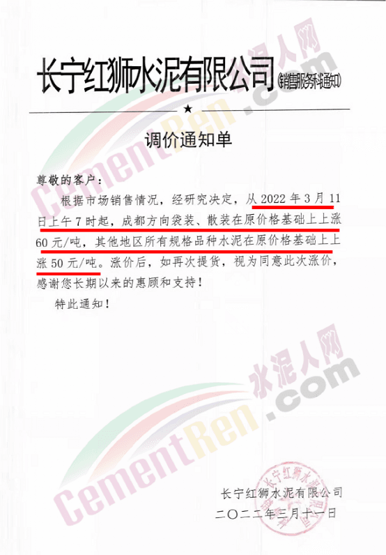 同日,梅州市紅日旋窯水泥有限公司通知自3月14日起各品種、各強度等級的袋裝水泥在原價基礎上上調50元/噸。