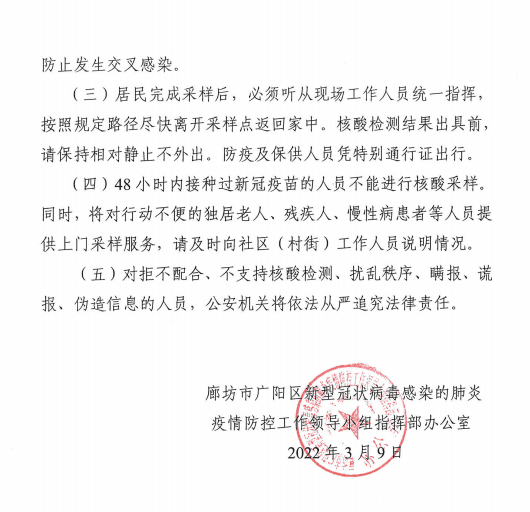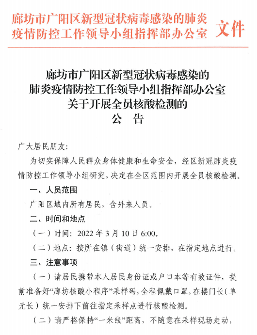 河北廊坊開發(fā)區(qū)決定在全區(qū)范圍內開展全員核酸檢測。
