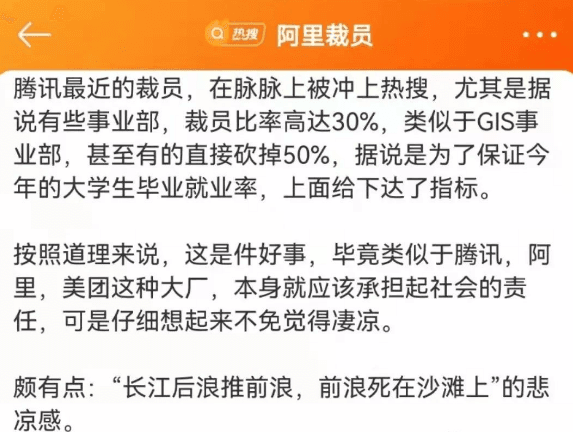 據水泥人網了解,近期阿里裁員、騰訊裁員迅速登錄熱門榜,騰訊預計裁員10~30%。而阿里旗下MMC事業(yè)群正計劃裁員,本次裁員數量約20%……現在的就業(yè)環(huán)境更是讓人后背發(fā)涼。